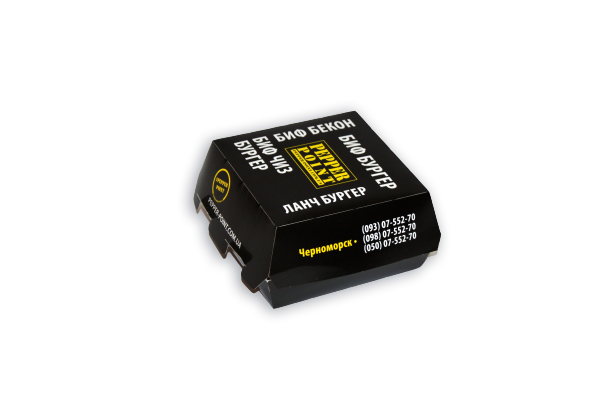 Коробка для бургера має стандартні габаритні параметри, що залежать від розмірів самого продукту, та форму. Вона універсальна у своєму застосуванні і дає можливість виробнику так упакувати бургер, щоб його було зручно їсти та транспортувати.